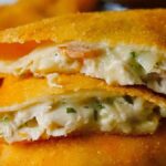 - Coating. To seal in the filling, the pancake is folded over then given a classic flour-egg-crumb coating. The technical term for this is to pané and results in a wonderfully crispy outer layer once fried.