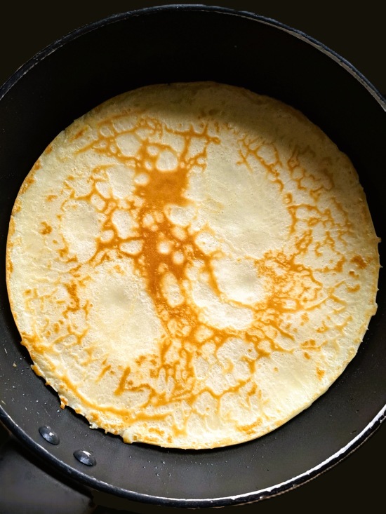 This will still give you 8 pancakes. As mentioned above, you can of course make smaller pancakes if you wish. When they’re done, stack the pancakes and leave to cool. I then cover with cling film and put in the fridge until needed.