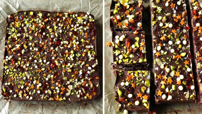 The crushed biscuit, raisin and chocolate base has mixed spice, cinnamon, orange zest, glacé cherries, stem ginger, and dried peel. The topping is dark and milk chocolate sprinkled with Christmassy nibbles including gold sugar stars. crystallized ginger, and chopped pistachios. You can easily swap in different dried fruits, spices etc if you don’t like any I’ve chosen.