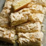 Coconut is one of my favourite flavours, so I’m especially partial to coconut cakes. And I think Coconut Meringue Slices is up there with the best. The buttery sponge is lovely; not airy-light but substantial and satisfying. On top the delicate, coconut meringue is both crispy and chewy.