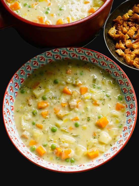 Cream of Vegetable Soup is beautifully simple but so tasty. Full of vegetables like carrot, leek, and peas, it’s subtly flavoured with garlic and herbs. Despite the name, like most traditional ‘cream of’ soups, it doesn’t contain cream. Its velvety texture is thanks to a combination of milk and stock, thickened with a classic roux of butter and flour.