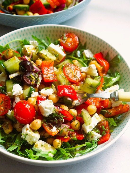 With nutritious chickpeas, crunchy and juicy veg like red pepper and tomatoes, plus herbs, feta, and a garlicky-lemon dressing, this healthy, delicious main course salad is perfect for a warm weather dinner.