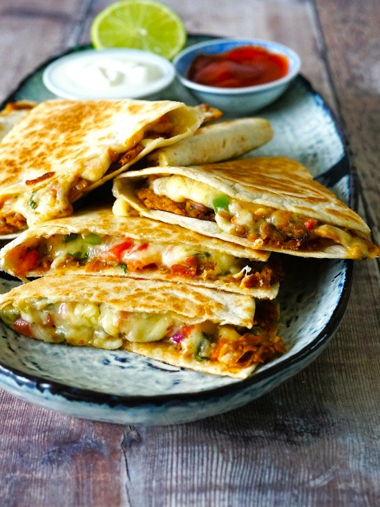 Crispy, cheesy and delicious whether you make them with canned refried beans or my quick and spicy homemade version. Simply spread over a tortilla wrap, add plenty of cheese plus vegetable salsa, then fold in half. Fry or griddle until browned and crunchy, the filling hot and melting.