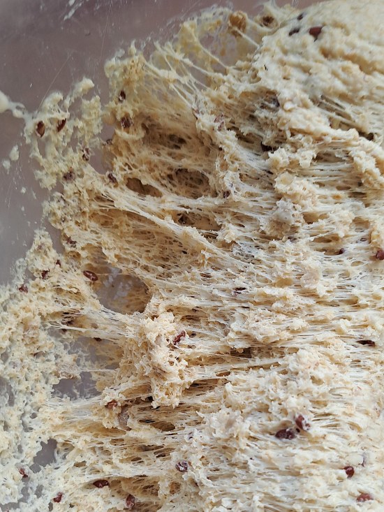 Lightly flour your work surface, ideally covered with a silicone mat, and scrape the dough onto it. Hopefully, you should see underneath the network of gluten strands.